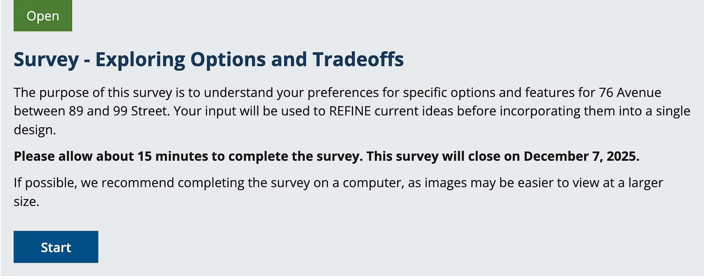 A new survey has been released by the City of Edmonton collecting feedback from residents. There are a couple options that your feedback can shape, mostly whether we get shared use paths, bi-directional or unidirectional bike lanes west of 95st, and options related to the crossing and intersection at 97st and 76ave.
